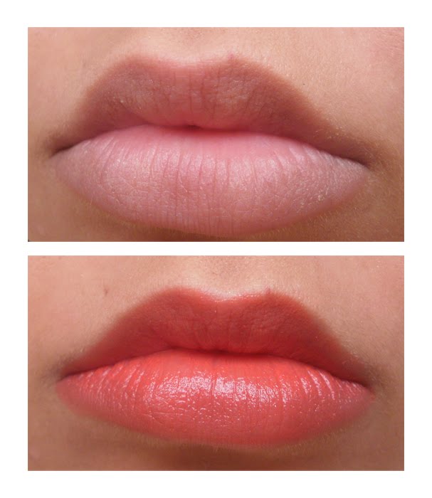La teinte est un orange satiné qui tire sur le rouge, un corail orangé très subtil, difficile à décrire (oh éh, t'as qu'à regarder et te faire ta propre idée aussi). La texture est über-crémeuse, super agréable à appliquer, au niveau du confort j'ai l'impression de porter un baume à lèvres, en mieux. Du coup, ça semble logique, il ne dessèche absolument pas la bouche et reste extrêmement agréable à porter. Il habille la bouche, je trouve presque qu'il se suffit à lui-même.